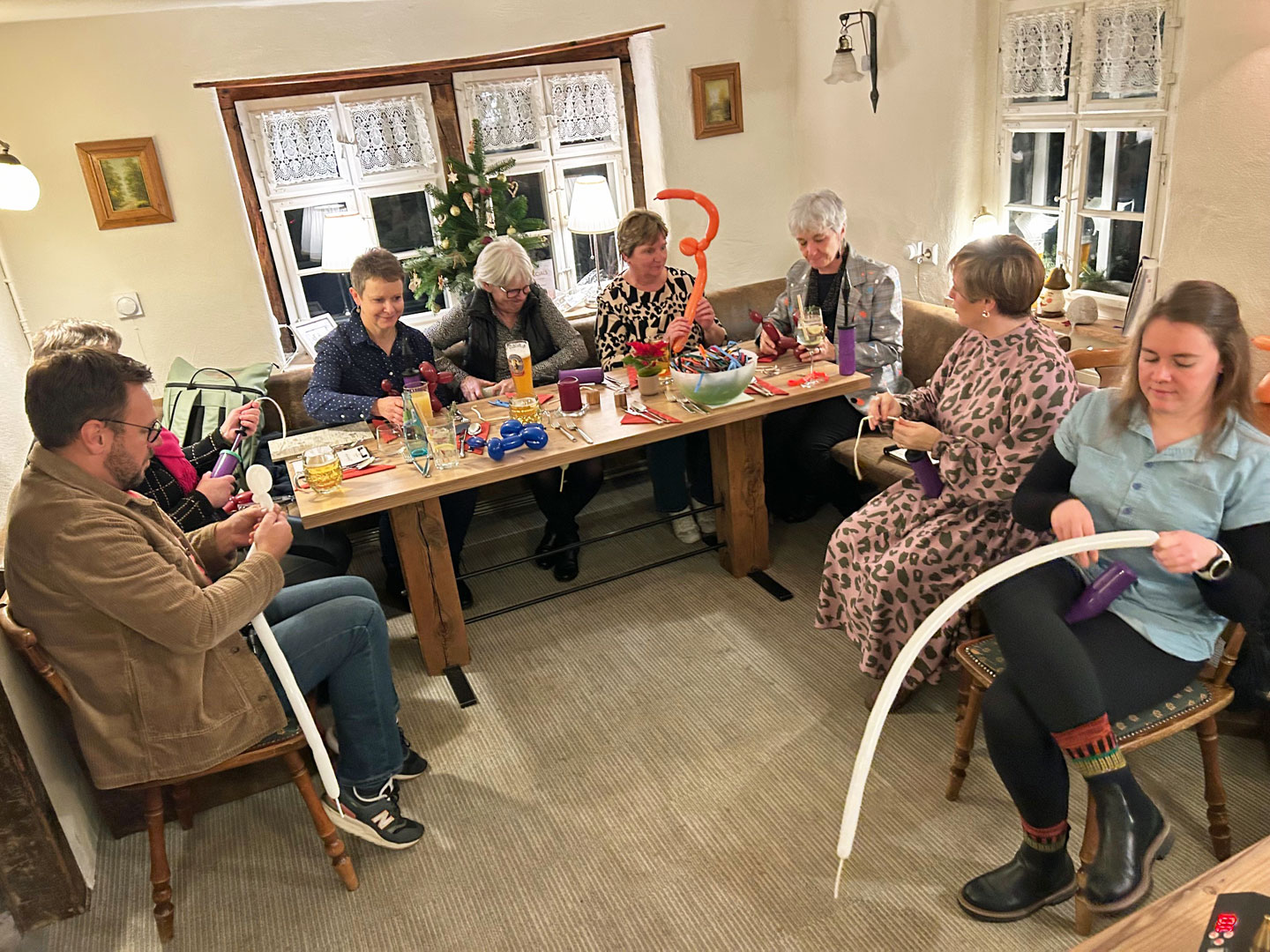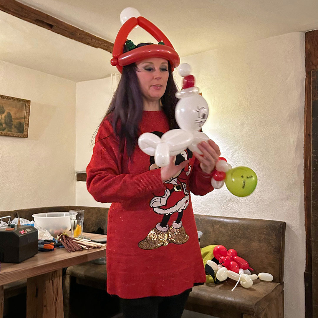 Stargast der Feier war Miss Peggy Balloni, die die Geheimnisse des Luftballon-Modellierens enthüllte. So entstanden in Zusammenarbeit von Vorstand, neuen und früheren Teammitgliedern Hunde, Schneemänner, Robben und Springmäuse, die Miss Balloni den Kindern im Universitätsklinikum Leipzig als Spende übergeben konnte.